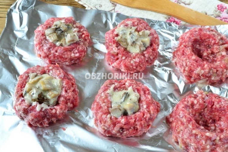 4. Из фарша сформируйте котлеты, в середине сделайте углубление, положите сливочно-грибную начинку.⠀